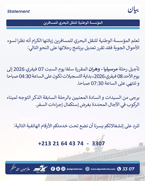 تعلم المؤسسة الوطنية للنقل البحري للمسافرين زبائنها الكرام أنه نظرا لسوء الأحوال الجوية فقد تقرر تعديل برنامج رحلاتها على النحو التالي: